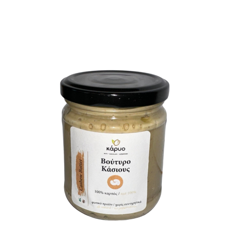 Καβουρδίζονται και αλέθονται από Το Κάρυο με 100% Κάσιους Ινδιών χωρίς πρόσθετα, χωρίς έλαια, χωρίς συντηρητικά.Μπορεί να περιέχει ίχνη από άλλους ξηρούς καρπούς ή από σισάμι.