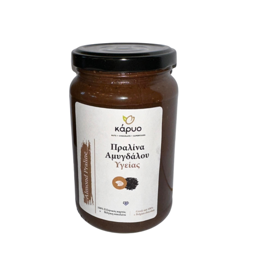 Από 60% Ελληνικό Αμύγδαλο που καβουρδίζεται και αλέθεται από εμάςκαι 40% Πραλίνα Υγείας Βελγίου