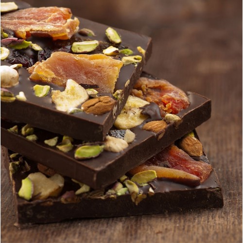 Χειροποίητη σοκολάτα υγείας εξαιρετικής ποιότητας με φρούτα, αμύγδαλα, φουντούκια, φυστίκια Αιγίνης, papaya και cranberries.